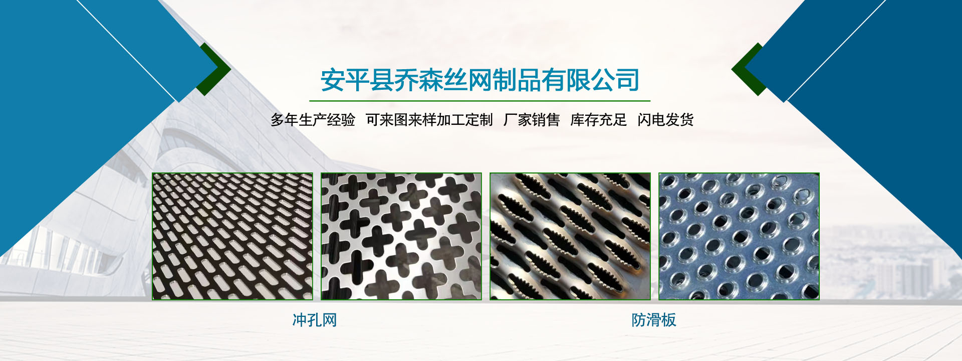 喬森絲網(wǎng)成立于2014年9月,位于中國(guó)絲網(wǎng)之鄉(xiāng)-河北省安平縣,是一家專(zhuān)注于生產(chǎn)金屬絲編織網(wǎng)、金屬網(wǎng)板沖孔及相關(guān)金屬裝飾絲網(wǎng)深加工產(chǎn)品的企業(yè)。從一個(gè)家庭式的小工坊到公司多年來(lái),一直本著以“質(zhì)量求生存,信譽(yù)謀發(fā)展”的生產(chǎn)原則兢兢業(yè)業(yè)穩(wěn)步向前,贏得了 一大批忠實(shí)客戶(hù)的廣泛贊譽(yù)。然騏驥一躍,不能十步,駑馬十駕,功在不舍。我們將以更周到的服務(wù),更過(guò)硬的質(zhì)量,不忘初心,為廣大的客戶(hù)提供更優(yōu)質(zhì)的服務(wù)。